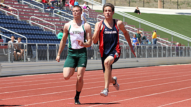 Chaparral's Alek McArthur put on a sprint clinic, winning all three sprint titles at the Pueblo Twilight. Photo by Alan Versaw.
