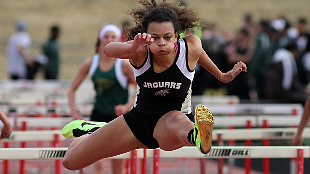 Rock Canyon's Rhyan Pettaway hurdled her way to the Palmer Terror Invitational 100H title. Photo by Alan Versaw.