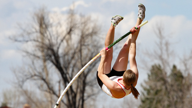 Heather Waite won her second meet title in a row and set a new PR at 12-0.5 at her home track. Photo by Alan Versaw.