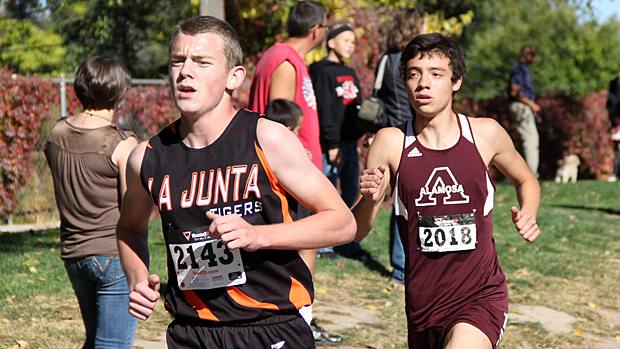 Alamosa's Jericho Ulibarri plays the patience game behind Gage Mayo early in the race. Ulibarri's strategy paid off with a second-place regional finish. Photo by Tim Hilt.
