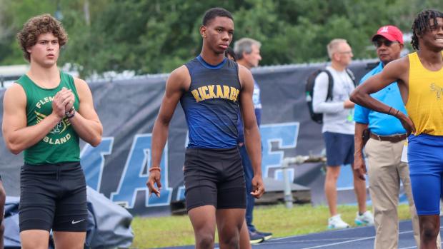 Davion Crumitie of Rickards HS at the start of last year's 3A boys 100m finals. The sophomore was 3rd with a 10.76. He was 4th in the 200m with a 20.88. This year, as a junior, he won the Florida High School Indoor Championships in the 60m (6.73) and the 200m (21.29). Outdoors, he leads the state and the nation in the 200m with a 20.72 with his win at the Chiles Track and Field Relays.
