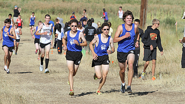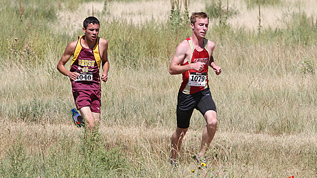 At 2.5 miles, Faith Christian's Evan Fortney briefly takes over the lead from Anthony Rios of Brush. The move, however, would prove to be premature as Rios would later reclaim the lead to win the small school race. Photo by Alan Versaw.