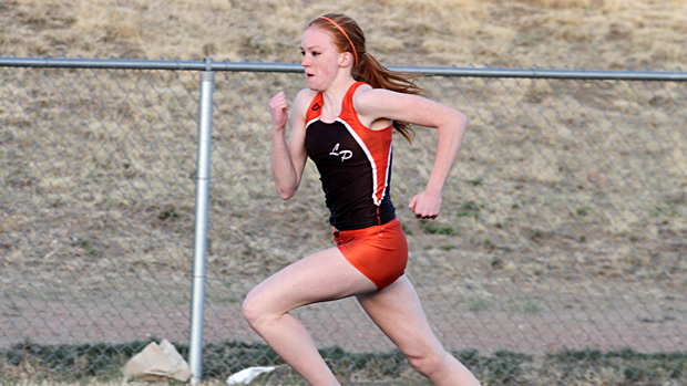 Lewis-Palmer freshman sprinter Nicole Montgomery made her mark in the world in the waning light of the girls 200 at Sand Creek. All photos by Alan Versaw.