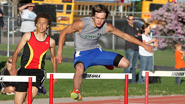 Doherty's Ryne Chavez posted one of the season's best 300 hurdle times with a 38.12 at Friday's Coronado Cougar Classic. Photo by Alan Versaw.