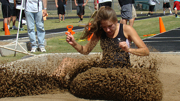 Grand Junction's Sabrina Trujillo turns over a little sand in the triple jump pit en route to winning that competition. Photo by Michele Bisbee.